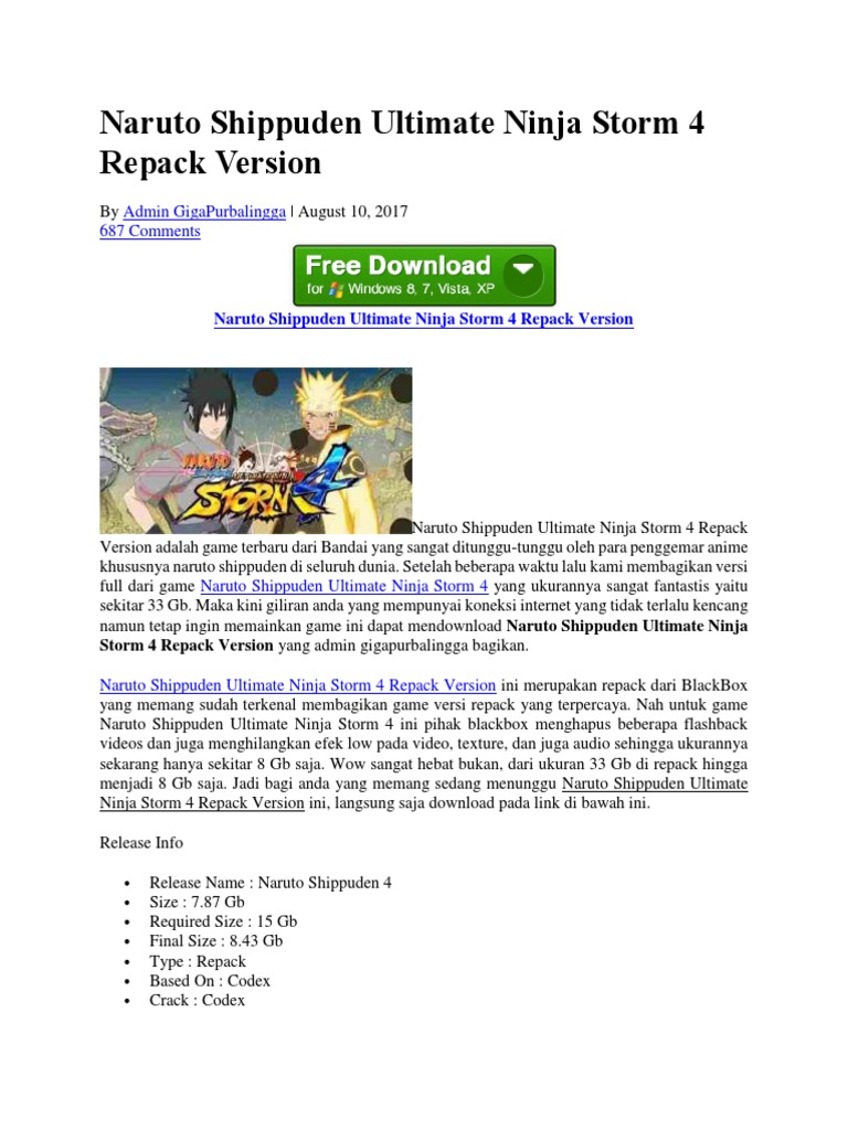 Free download naruto shippuden. Naruto shippuden ultimate ninja storm 4 full repack black box by ipeenk posted on february 4 2017 august 27 2018 download game gratis naruto shippuden ultimate ninja storm 4 full repack naruto shippuden ultimate ninja storm 4 merupakan game yang diambil dari sebuah anime jepang yang bernama naruto.